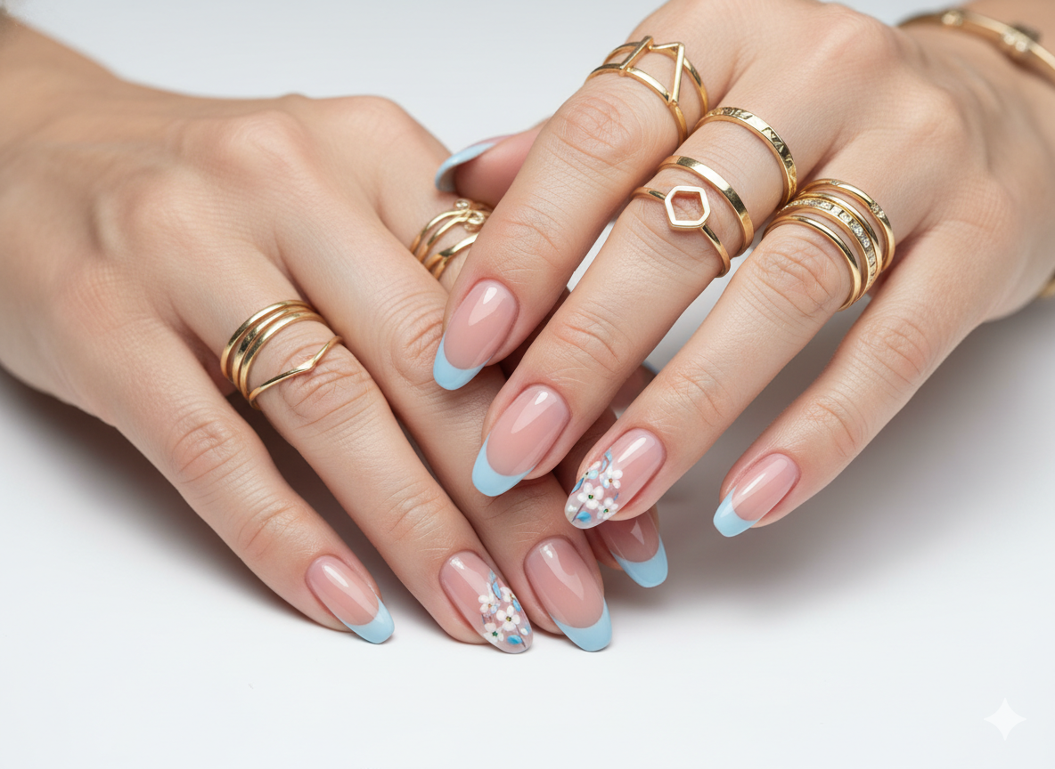 10 Elegant Blue Floral Almond Nails with Gold Rings for Women Over 50: Timeless Style Guide