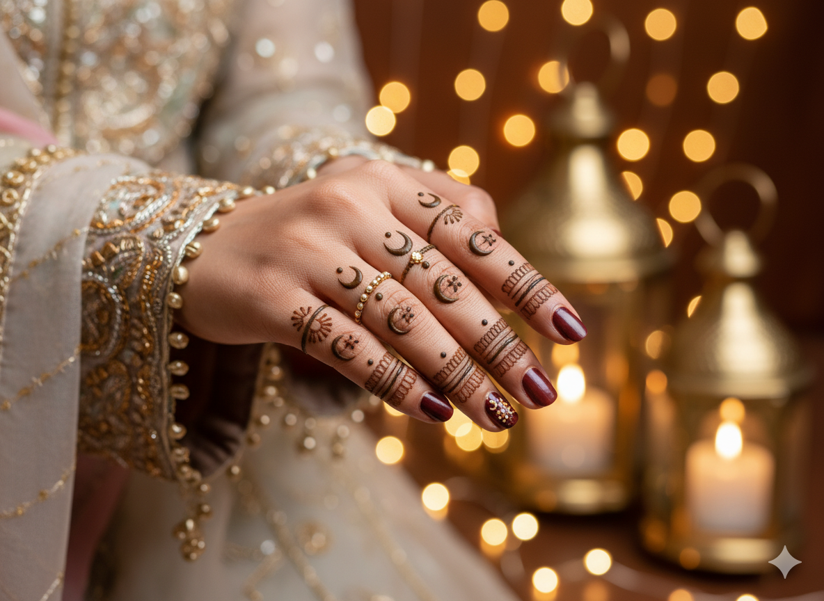 Tiny crescent moons on fingers combined with rings of henna create a trendy appearance.