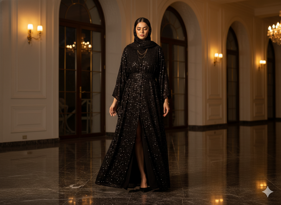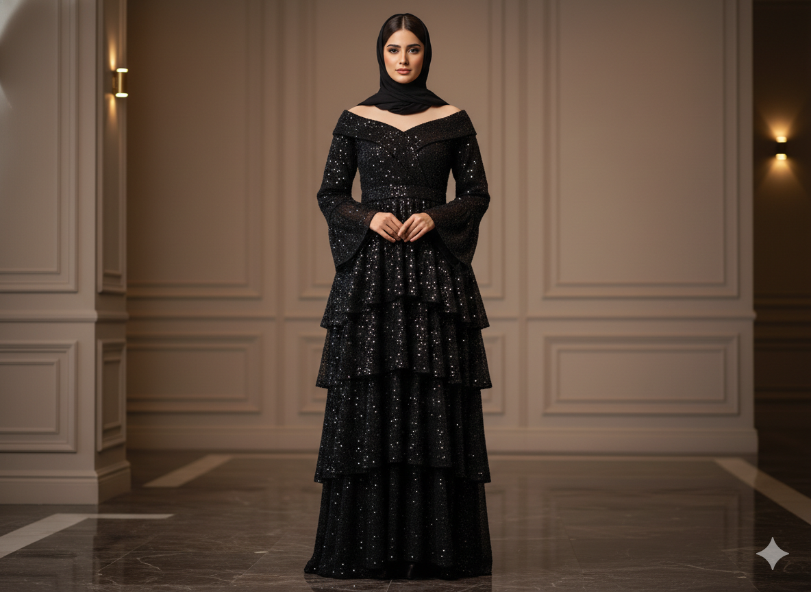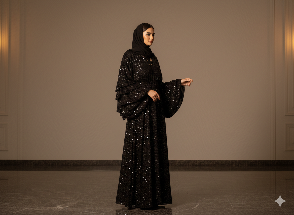 Layering adds dimension to evening wear. A layered black sequin abaya might feature multiple tiers or panels, giving a flowing, dramatic effect. Sequins on each layer catch light differently, creating a dazzling effect for parties.