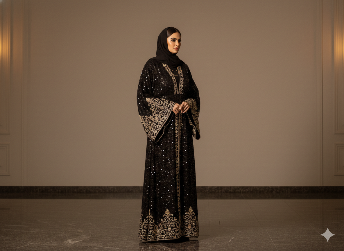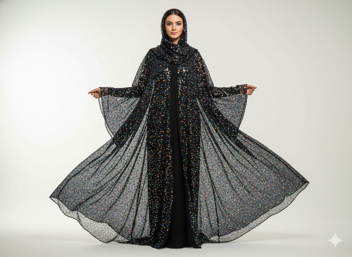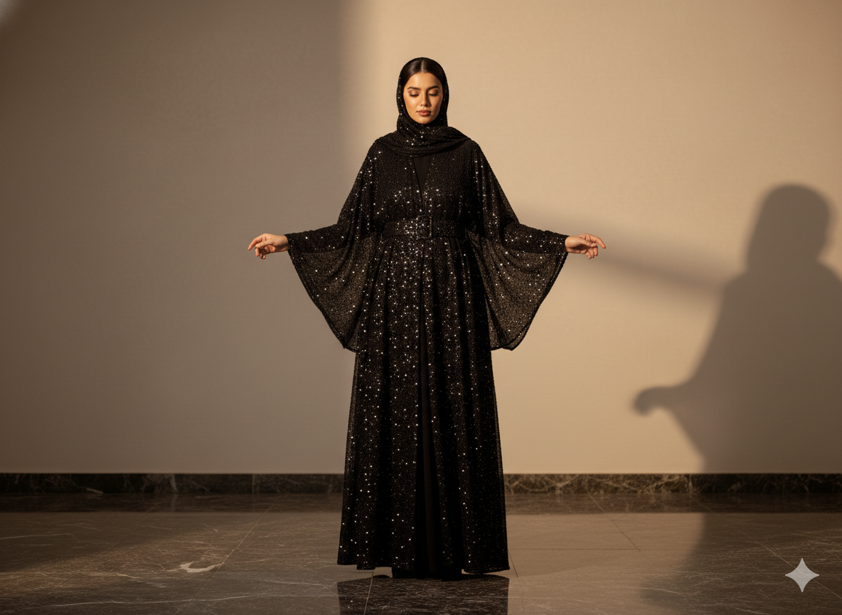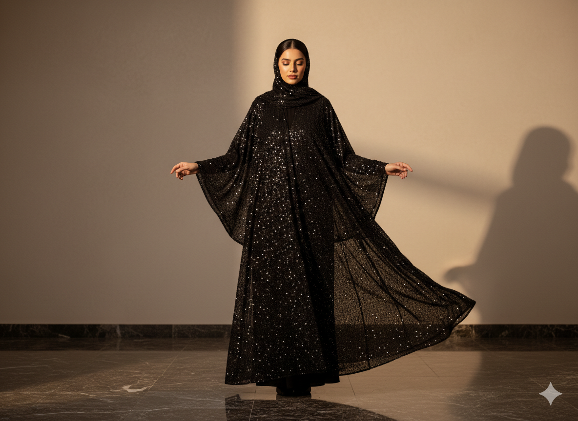 Layering adds dimension to evening wear. A layered black sequin abaya might feature multiple tiers or panels, giving a flowing, dramatic effect. Sequins on each layer catch light differently, creating a dazzling effect for parties.