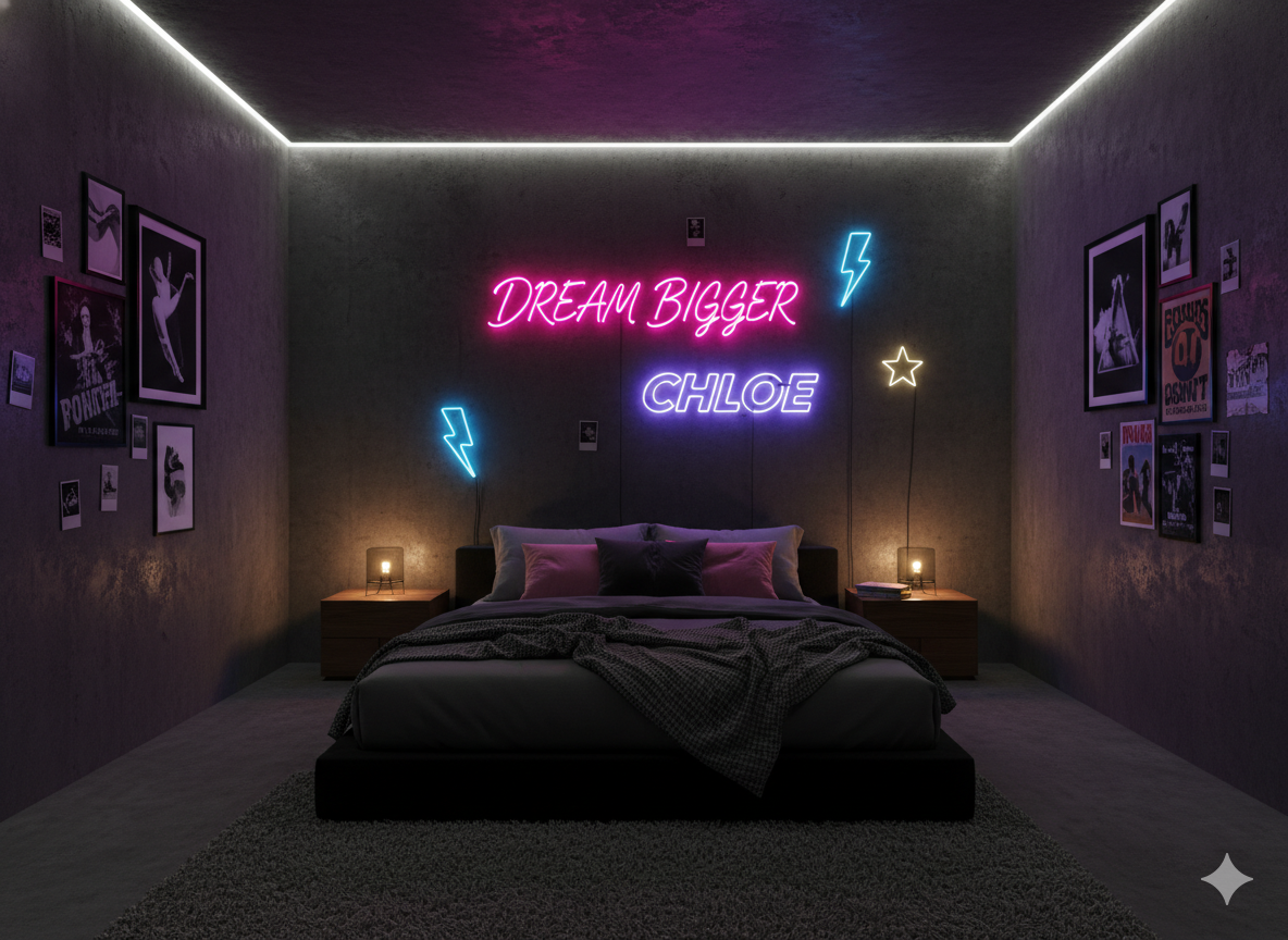 Add a modern touch with LED neon signs in soft pink tones. Words like “Dream,” “Love,” or “Stay Cozy” work perfectly with this theme.