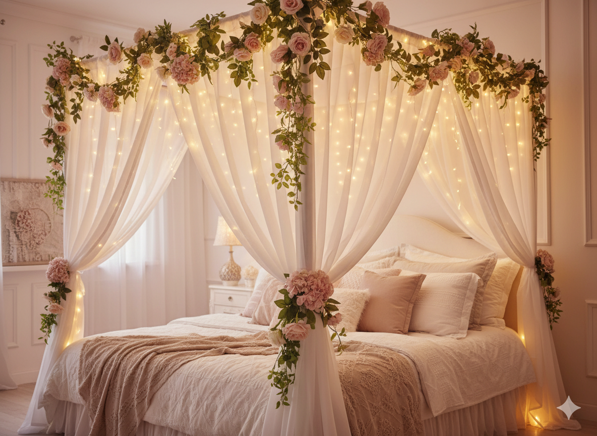 You can also attach artificial cherry blossom vines to the canopy for a whimsical, fairytale-like look that feels both luxurious and cozy.