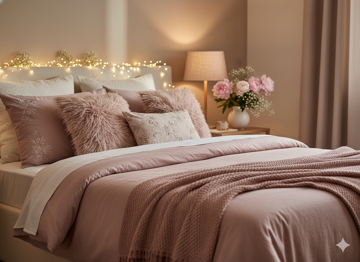 Your bedding plays a major role in achieving this look. Choose soft pink comforters, floral pillows, and textured throws.