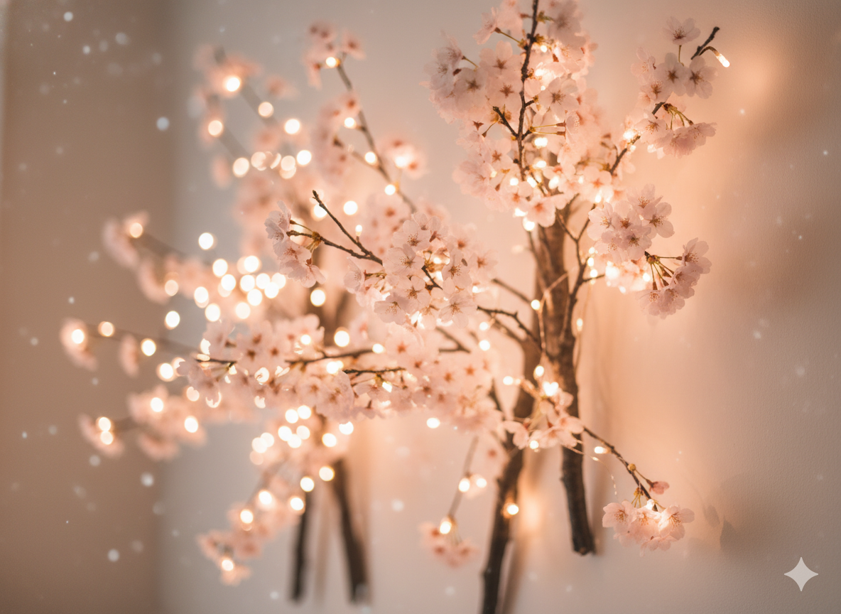 Enhance the look by draping warm fairy lights across the branches. The glow of the lights makes the blossoms appear more lifelike and adds a magical atmosphere, especially at night.