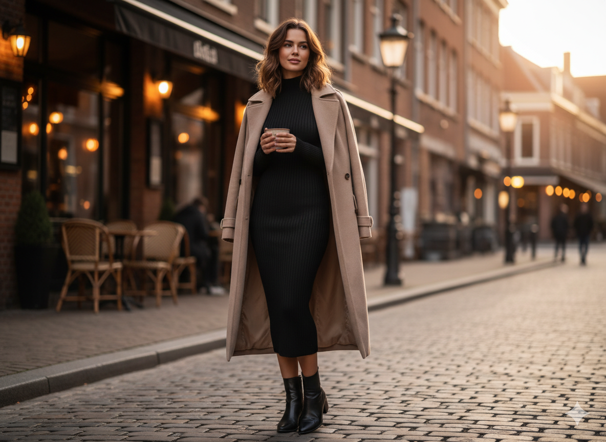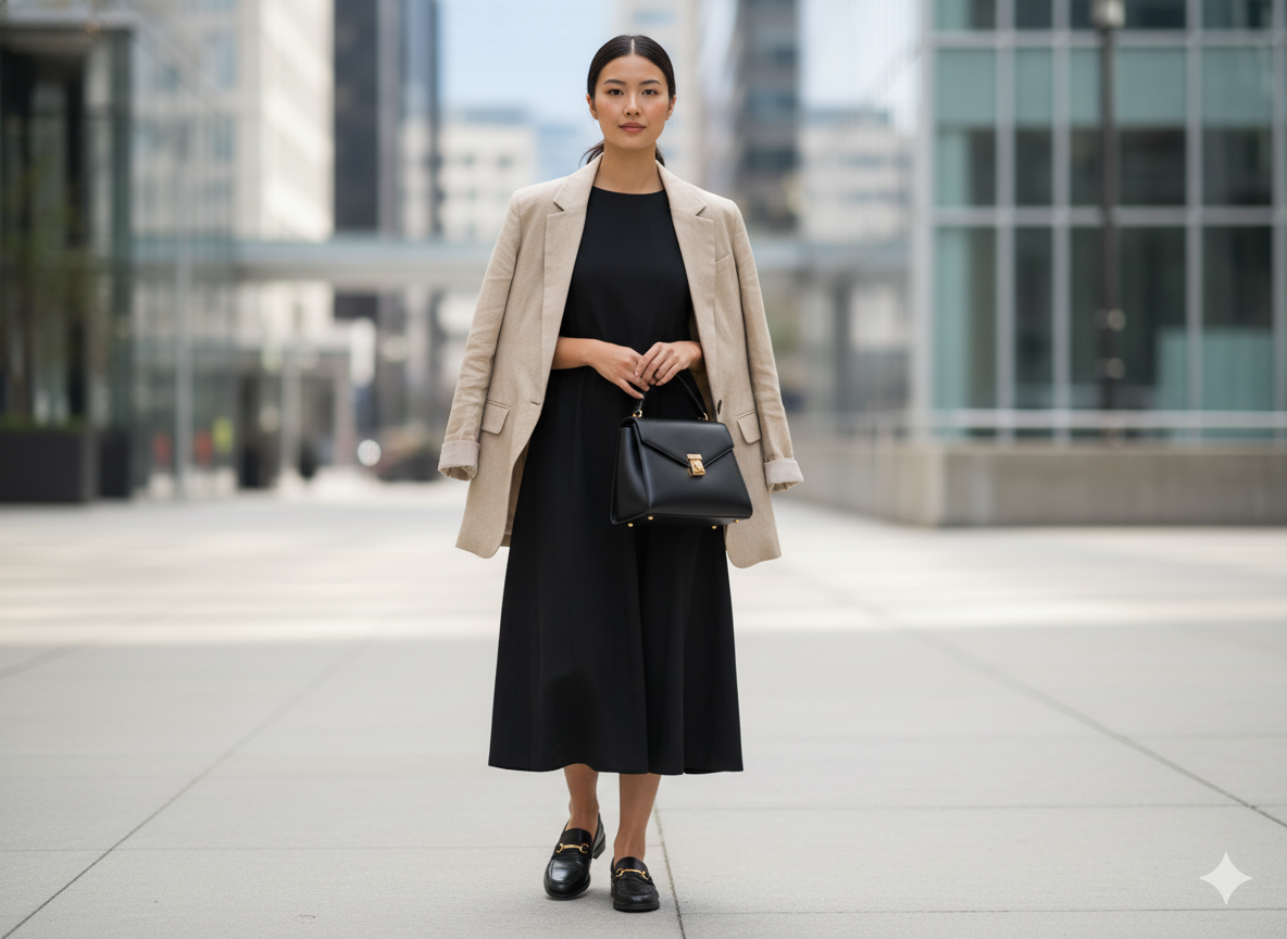Layering is key in 2026 fashion. Pairing a black midi dress with an oversized blazer creates a structured yet relaxed look.
