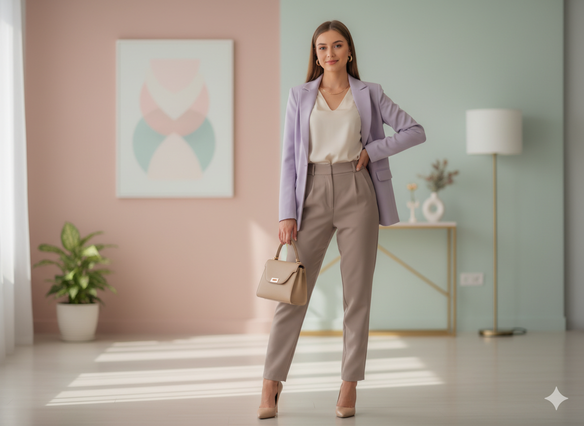 Outfit Idea: A pastel blouse under a light beige blazer paired with high-waisted trousers and loafers is a chic office-ready look. Add a silk scarf for a subtle, feminine touch.