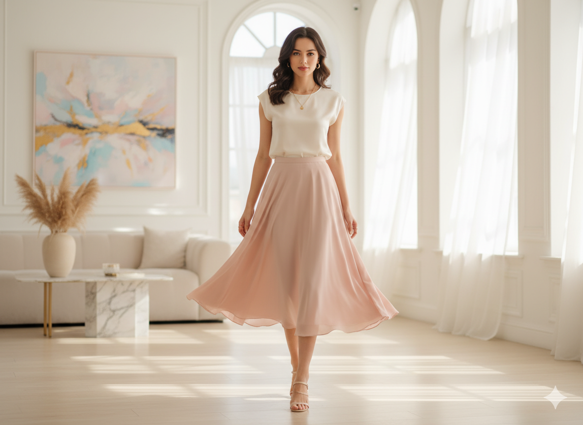 Outfit Idea: A midi-length chiffon skirt paired with a fitted silk blouse and strappy sandals is perfect for a spring or summer day. Complete the look with a structured handbag for a modern touch.