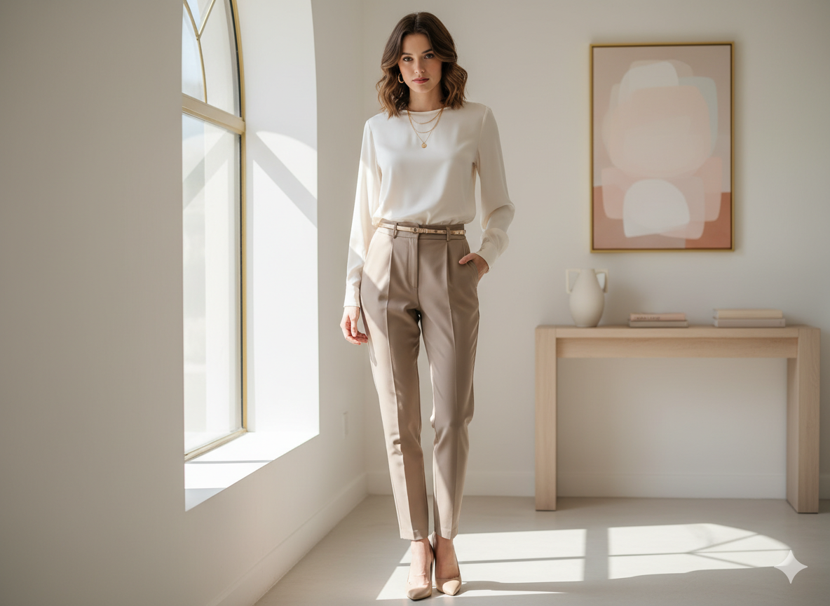 Outfit Idea: A cream-colored silk blouse tucked into high-waisted taupe trousers paired with pointed-toe heels is perfect for the office or a formal lunch. Add a thin belt and minimal jewelry to complete the look.
