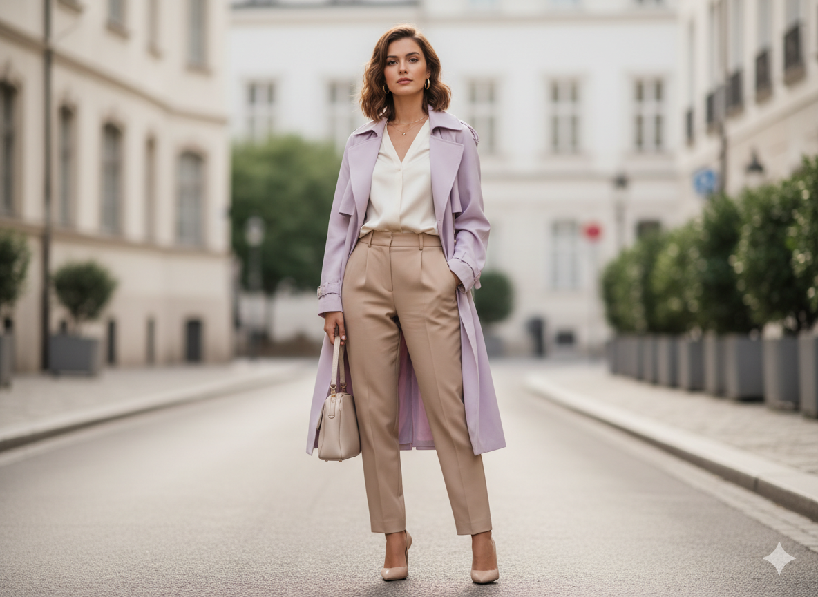 Outfit Idea: A pastel trench coat layered over a cream blouse and wide-leg trousers adds instant chicness to a simple outfit. Finish with pointed flats or heels.
