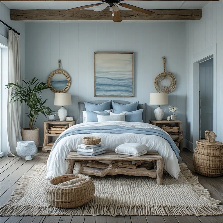 Coastal bedrooms feel fresh, airy, and relaxed. Blues, whites, and light beige tones mimic the beach, creating a soothing environment. Nautical accents like ropes, seashells, or driftwood furniture add charm. Soft natural fabrics like linen or cotton enhance comfort. Coastal bedrooms are perfect for muses who want a bedroom that feels like a seaside retreat—calm, light, and endlessly relaxing.