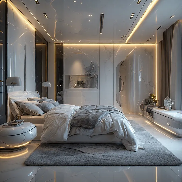Futuristic modern bedrooms are sleek, innovative, and stylish. Low-profile furniture, innovative lighting, and high-tech features create a cutting-edge look. Clean lines, metallic accents, and minimalist decor enhance the futuristic vibe. This bedroom is perfect for modern muses who enjoy tech-friendly, sophisticated, and ultra-stylish private spaces.
