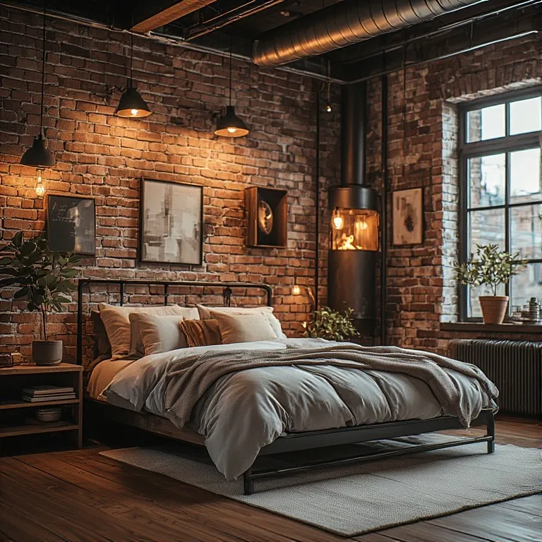 Industrial bedrooms combine urban edge with comfort. Exposed brick walls, metal furniture, and raw wood create a modern loft feel. The addition of soft textiles and warm lighting prevents the space from feeling cold. Industrial chic is ideal for muses who enjoy bold, edgy interiors while still craving cozy vibes for rest and relaxation.
