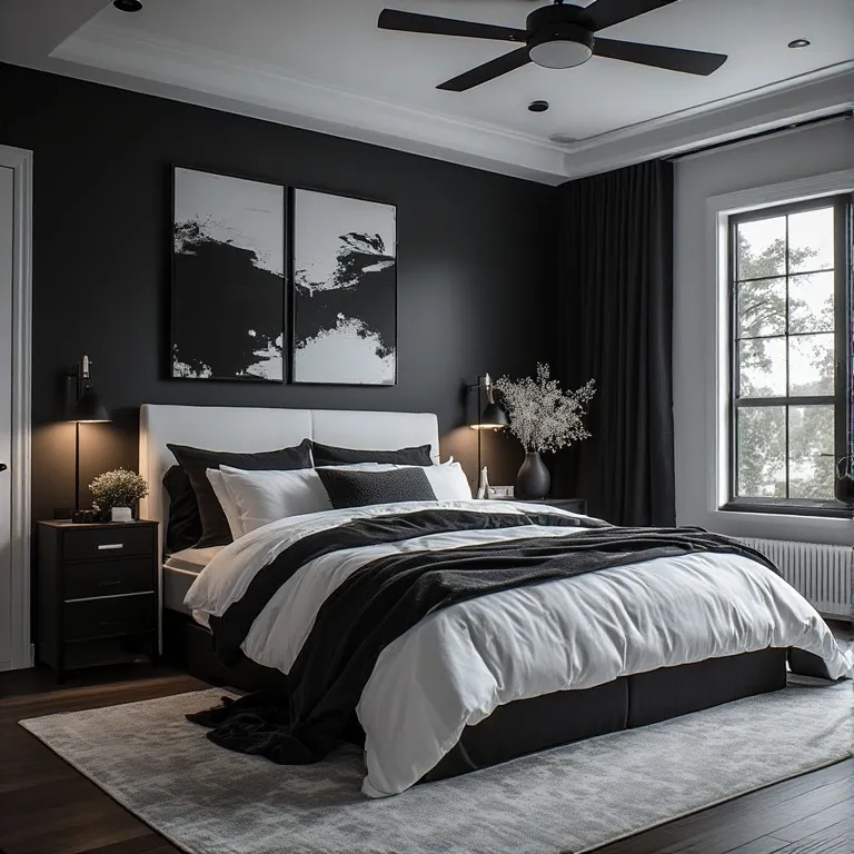 A monochrome black and white bedroom makes a bold, stylish statement. Black and white contrast creates a visually striking effect that feels modern and edgy. Keep furniture and decor simple so the room doesn’t feel too busy. Add a few statement pieces, like a black headboard, patterned pillows, or modern wall art. Lighting plays a key role in balancing the darkness with brightness. This style is perfect for muses who love contemporary, clean, and dramatic aesthetics.
