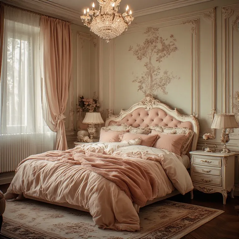 Vintage glam bedrooms feel luxurious and romantic. Antique furniture, soft fabrics like velvet or satin, and delicate lighting create a dreamy space. Chandeliers or classic wall sconces add a sophisticated glow. This style is perfect for muses who love romance, elegance, and timeless charm in their private sanctuary.