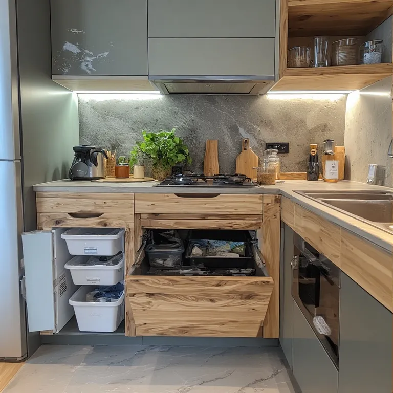 Built-in recycling stations make waste sorting easy. They help keep the kitchen clean and encourage eco-friendly habits.