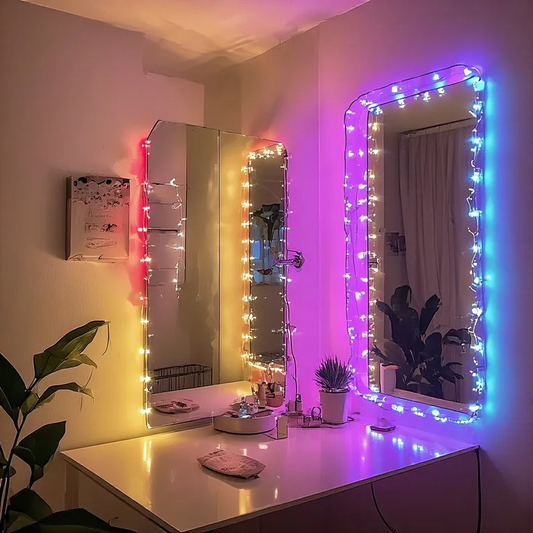 Adding LED lights behind mirrors creates a soft glow. It’s perfect for getting ready and taking photos. This setup feels modern and classy.