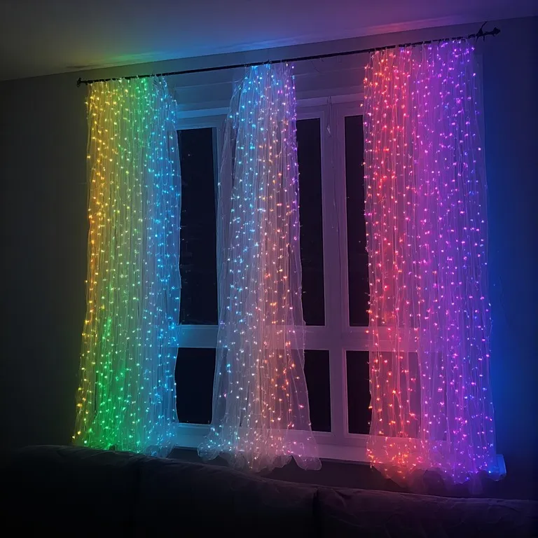 LED curtain lights on windows look beautiful at night. They add sparkle and make the room feel warm and welcoming. It’s like having glowing curtains.