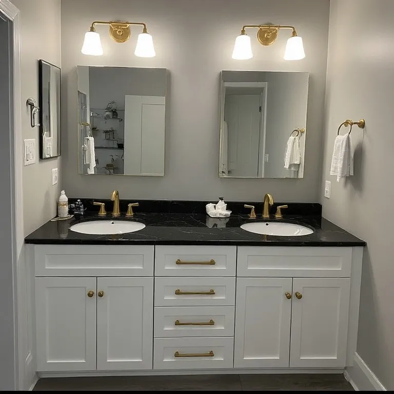 Cabinets are important in every bathroom. They give storage and help keep things clean. Matte black cabinets look modern and smooth. When you add gold handles, they look even better.