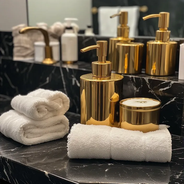 Small details complete the design. Gold soap dispensers, towel racks, and trays add a finishing touch.