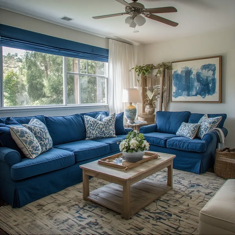 Use blue sofas, cushions, or rugs with neutral walls.