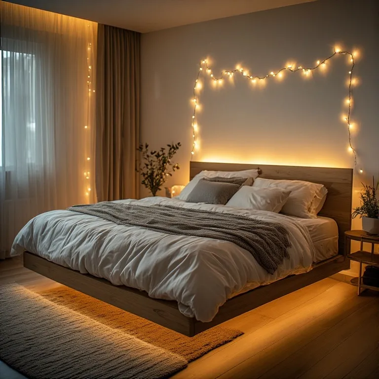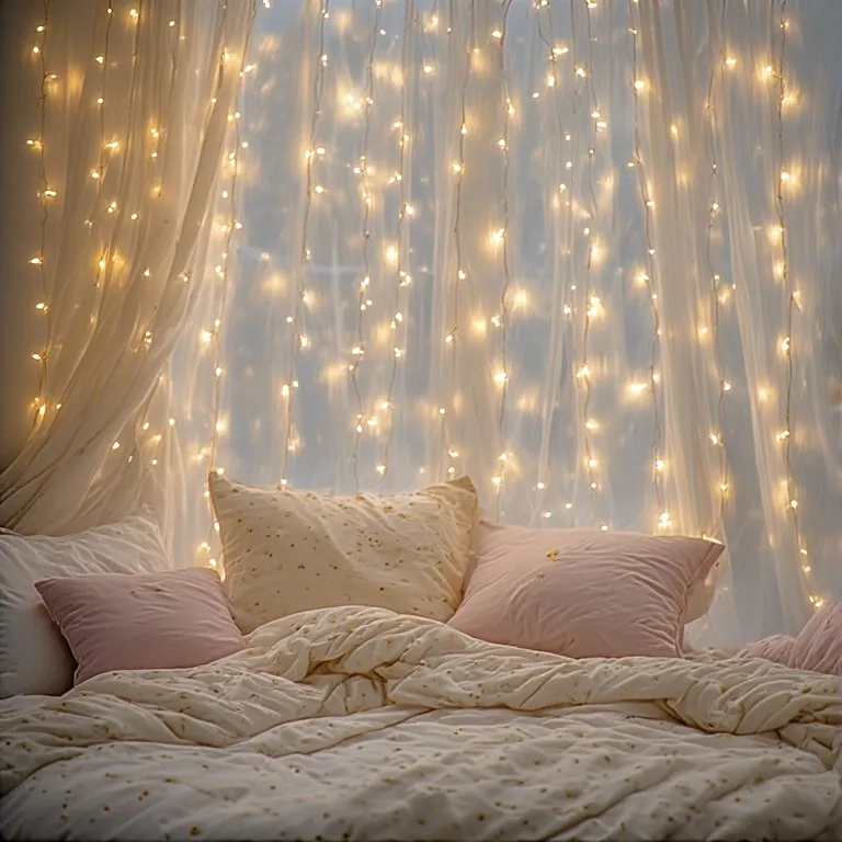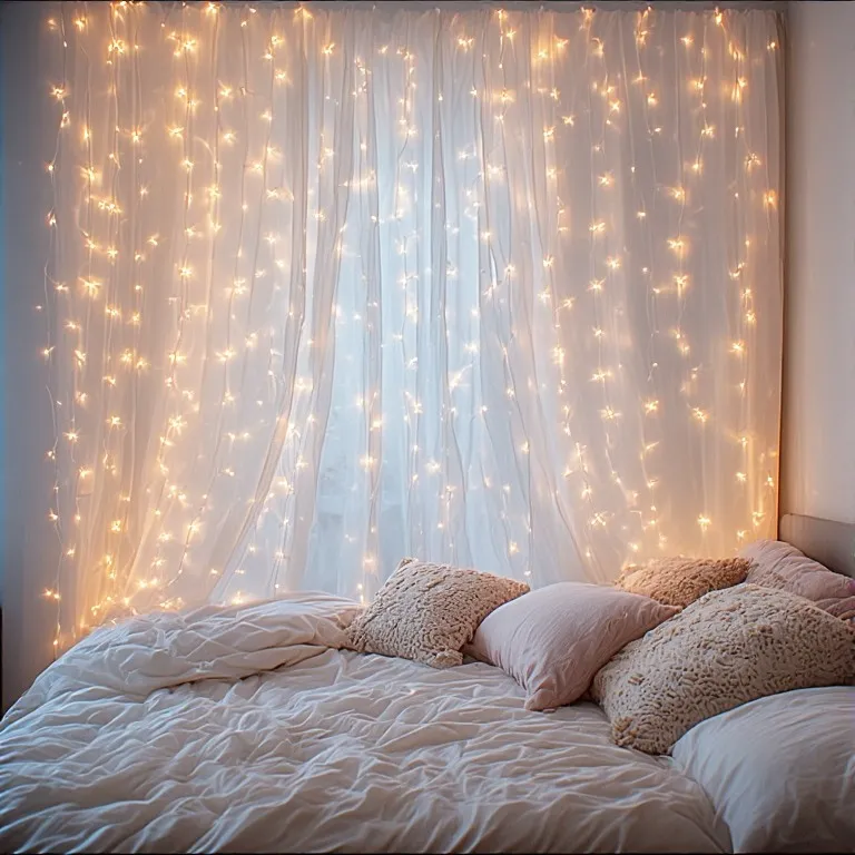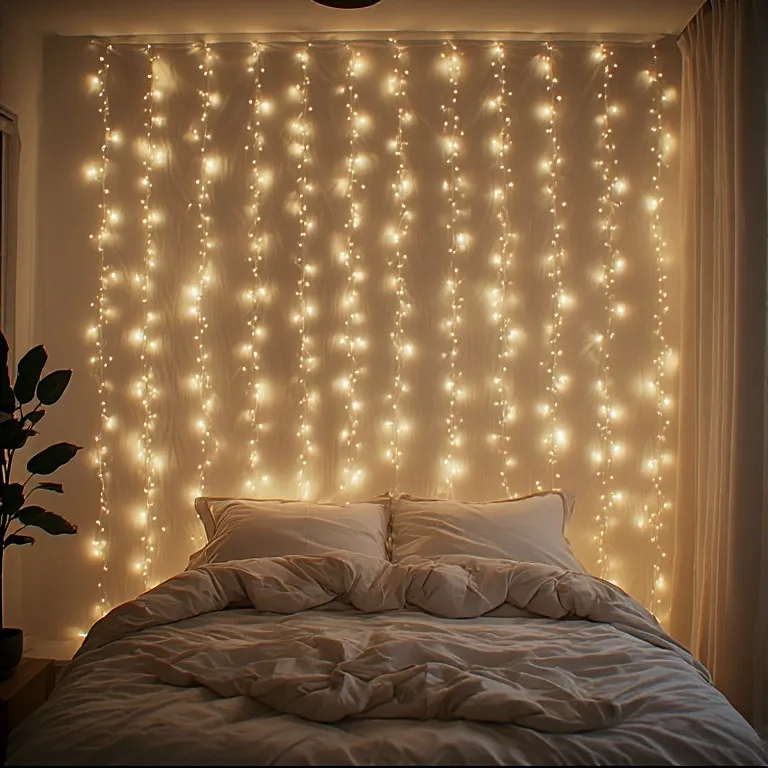 Cover one full wall with curtain fairy lights. This creates a glowing background. It looks amazing behind your bed.