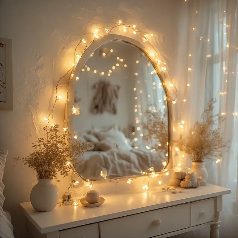 Wrap fairy lights around your mirror frame. It gives soft lighting for selfies and makeup. It feels like a mini dressing room.