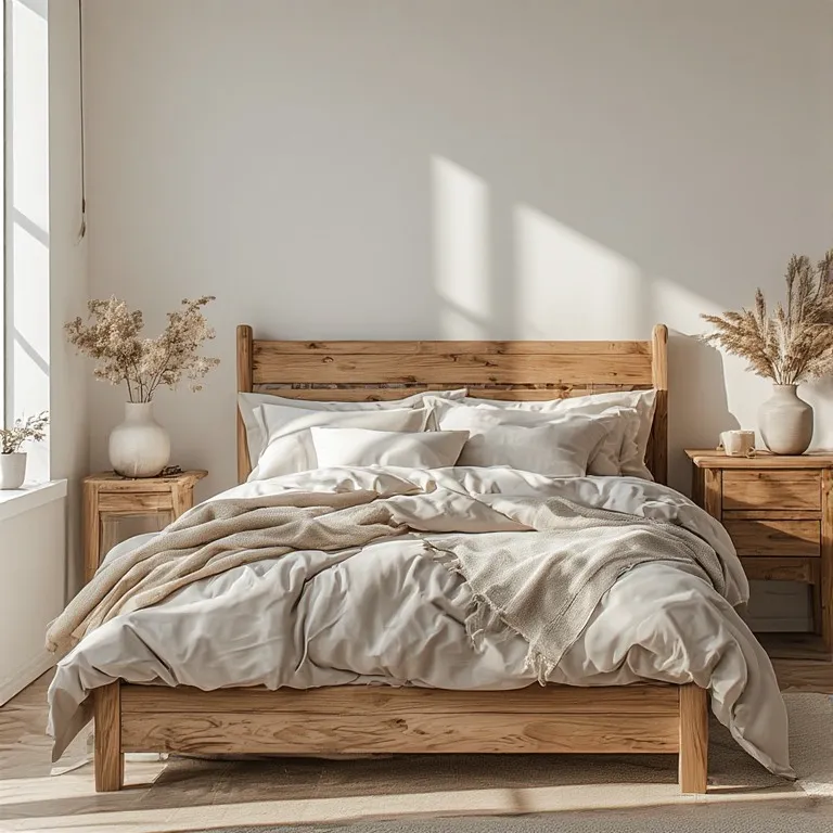 Wood brings natural warmth to a room. A wooden bed frame or small wooden table can make your bedroom feel cozy.