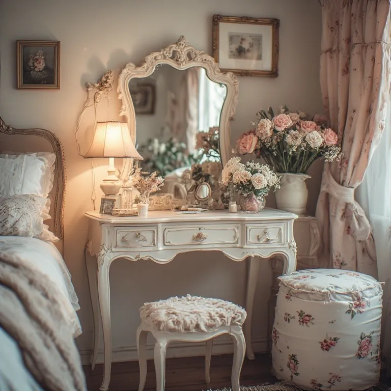 You don’t need a huge table. Even a small vintage-style desk works. Add a small vase with flowers. Maybe a cute perfume tray. It feels warm and sweet.