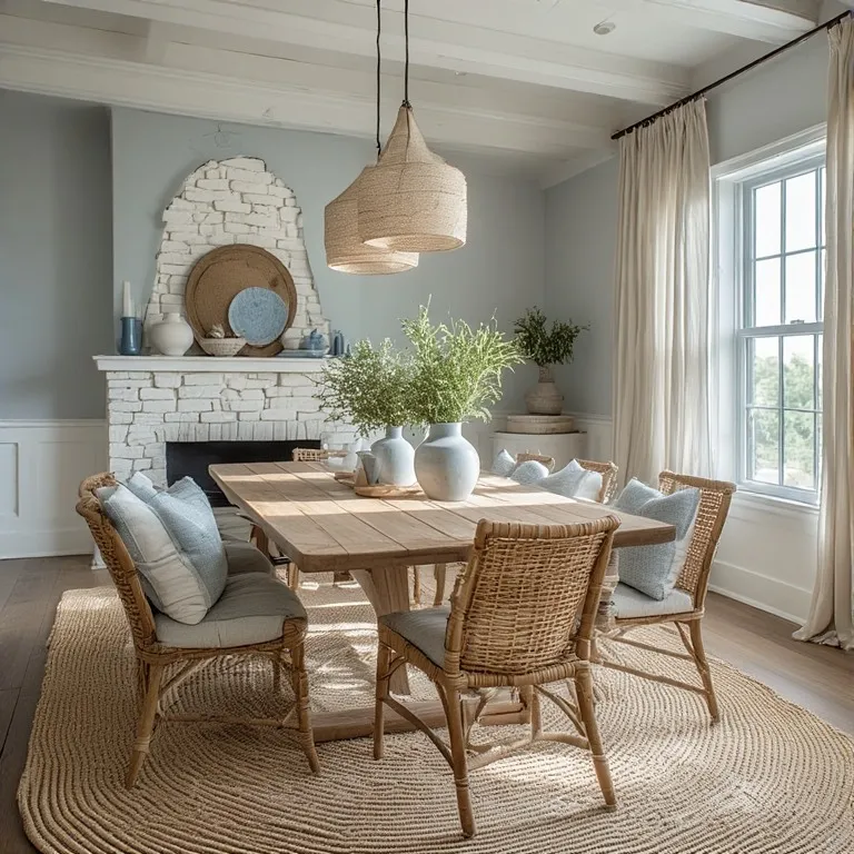 To create this look, keep the space bright and open. Use light wooden chairs and a simple dining table. Add soft blue cushions or a natural woven rug. The fireplace adds warmth, especially during cooler evenings, while still keeping that breezy feeling. This style is perfect if you want your dining room to feel peaceful and easy, like a holiday by the sea.