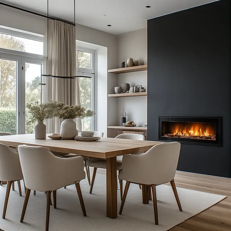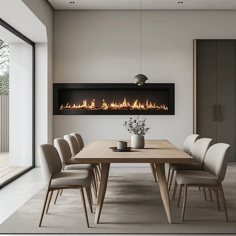 A minimal neutral dining room focuses on calm and balance. The colors are mostly beige, cream, soft brown, and light gray. The fireplace blends smoothly into the wall. It does not shout for attention, but it quietly adds warmth and beauty.