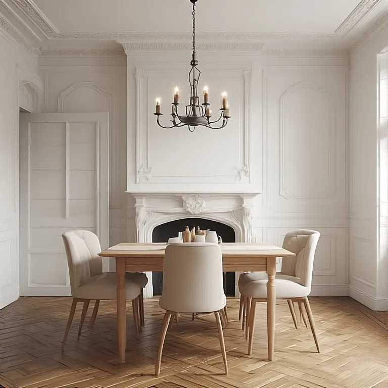 Use a wooden dining table with carved legs and soft fabric chairs. Add a simple chandelier for extra beauty. The fire makes the room feel warm and welcoming. This style feels like a cozy home in the countryside of France. It is perfect if you love soft, graceful design with a touch of tradition.