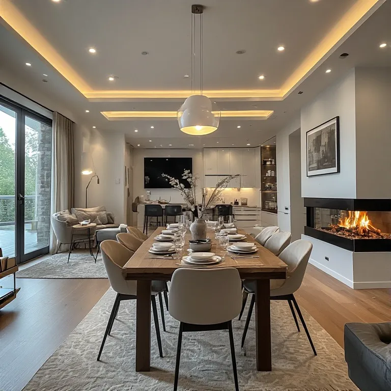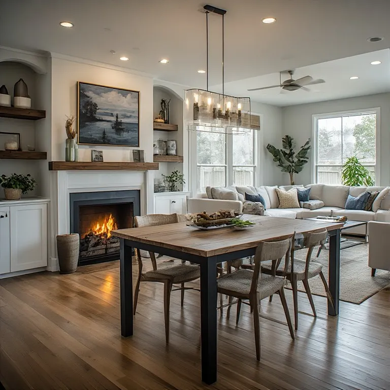 In this design, the fireplace often sits in the center or on a shared wall. It acts like a bridge between rooms. The dining table feels connected to the cozy seating area. This layout is perfect for family homes where everyone gathers together. It feels open but still warm and inviting.