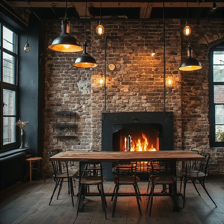 An industrial dining room with a fireplace has a bold and strong personality. It often uses materials like brick, metal, and dark wood. The fireplace may have a black metal frame or raw brick surround. This style feels modern but also a little rugged.