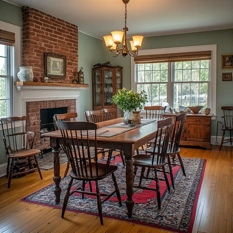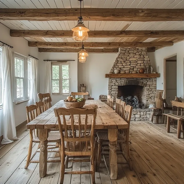 A rustic farmhouse dining room feels warm and welcoming. The fireplace is often made of natural stone or brick. Wooden beams on the ceiling add extra charm. The whole space feels like a countryside retreat.