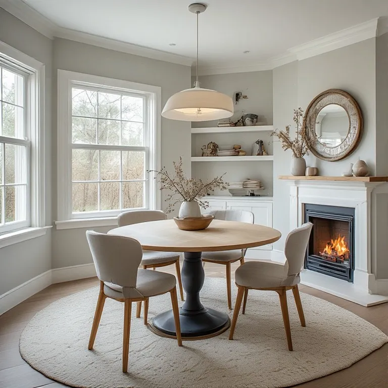 Use a round dining table to make movement easier. Choose light colors to keep the room feeling open. The fireplace adds coziness without making the space crowded. Small spaces can feel even more intimate with a soft glowing fire nearby. It turns a tiny room into a warm and charming dining corner.