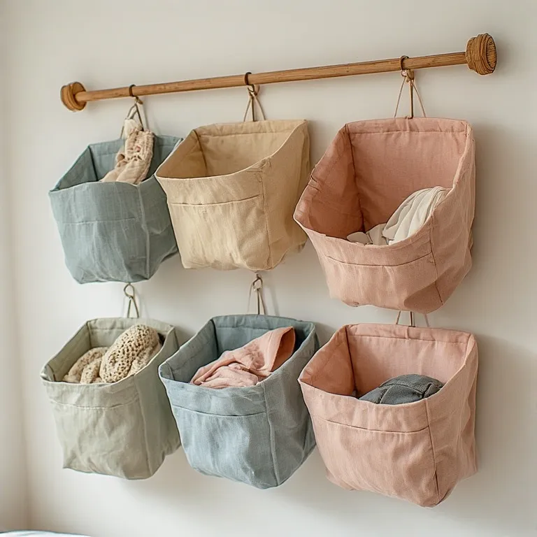 Sew rectangular bins with reinforced bottoms. Attach them to a larger fabric backing. Slide a wooden rod through the top.