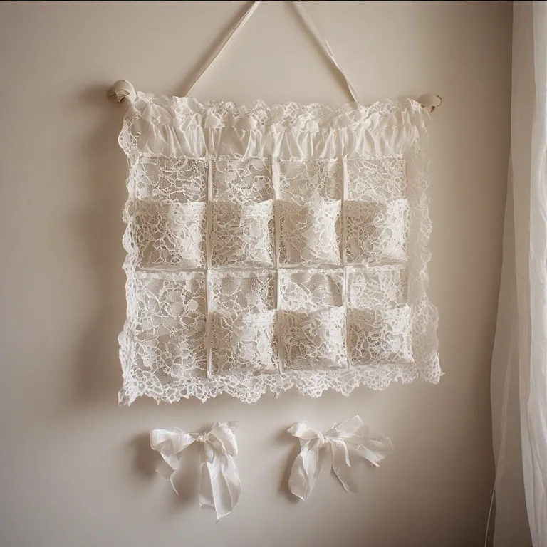 Sew pockets onto lace fabric. Attach ribbon to hang it. Place lightweight items inside.