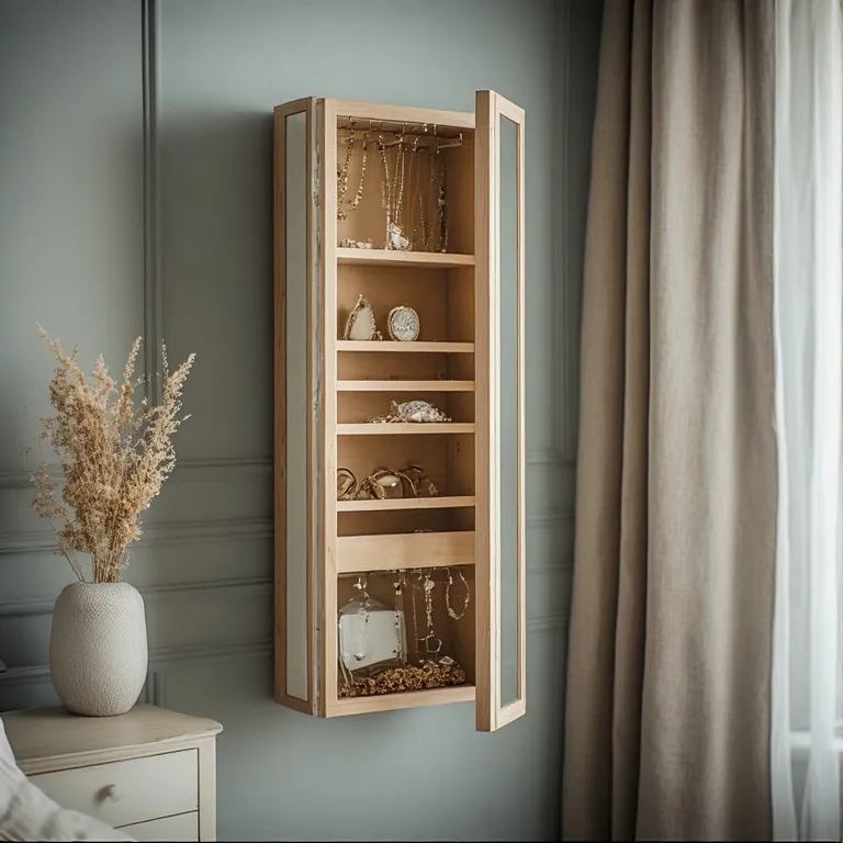 Install a mirror cabinet on the wall. Inside, add small hooks and shelves for jewelry or makeup.