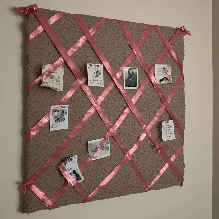You will need a cork board or foam board, soft fabric (like velvet or cotton), ribbons, small decorative clips or push pins, glue gun, and scissors. Choose soft colors like blush pink, beige, or light grey. Satin ribbons work beautifully because they shine softly under the light.