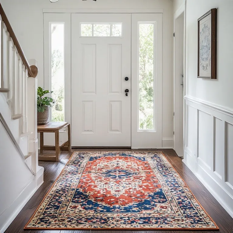A rug adds warmth and color. It also protects your floor. Choose a runner if your entry is narrow.