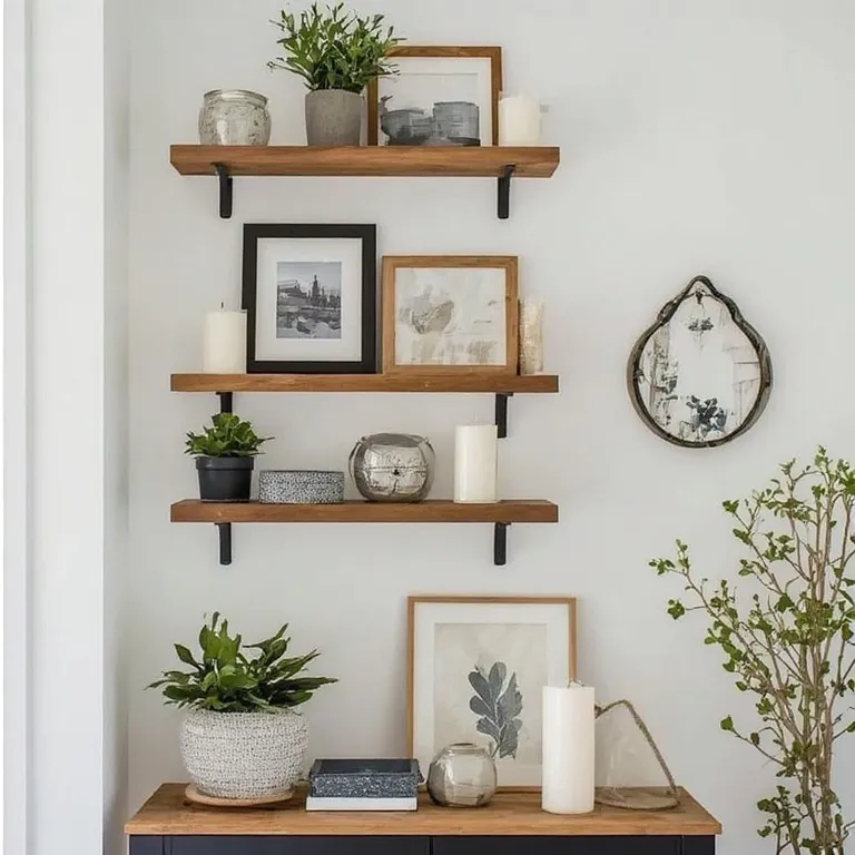 Floating shelves are perfect for small spaces. They give you storage without bulky furniture. You can place them above a console table or even on an empty wall near the door.