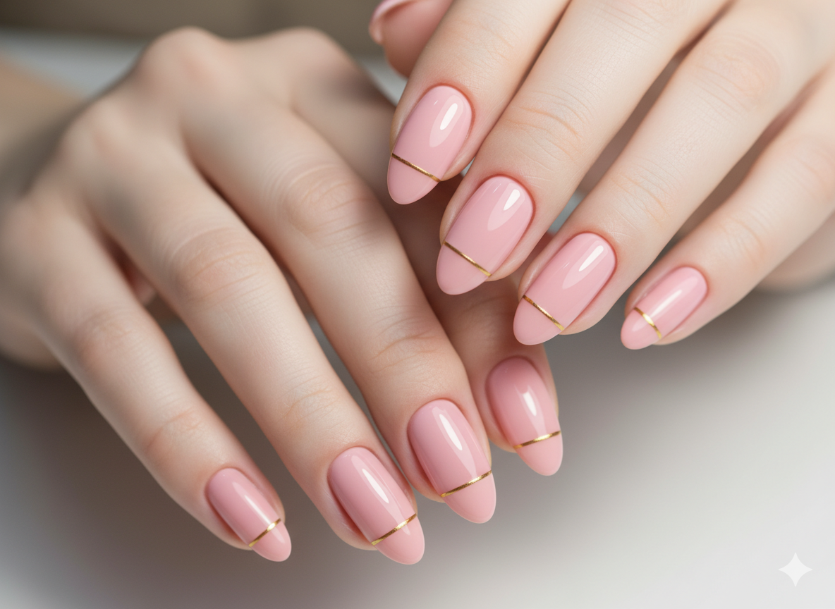 Soft pink nails with thin golden line for luxury beauty style.