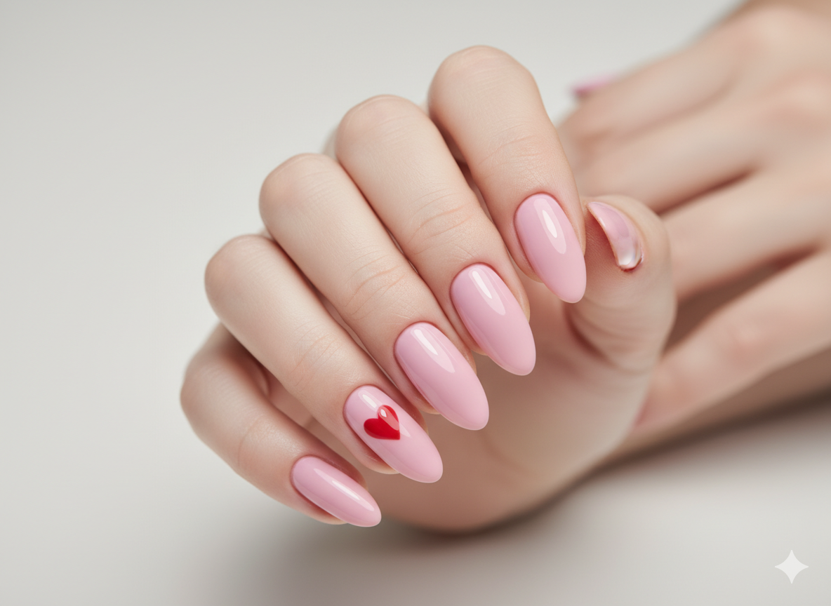 Glossy pink base with small heart shape decoration on one or two nails.