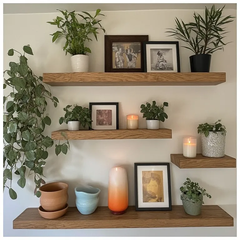 Floating shelves are both useful and decorative. They hold plants, candles, and small decor pieces. Wooden shelves add warmth to plain walls.