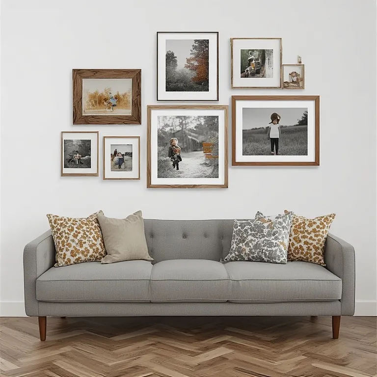 Combine small and large frames. Add a mix of wood tones. Keep the layout balanced. Lay everything on the floor first to plan the design.