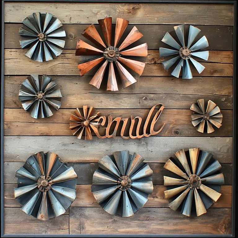 Metal pieces like windmills, letters, or simple shapes add contrast. The cool metal balances the warmth of wood.