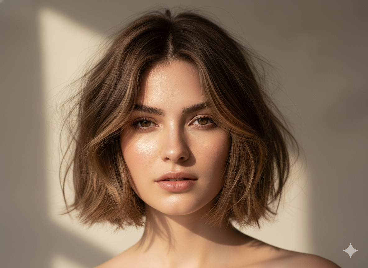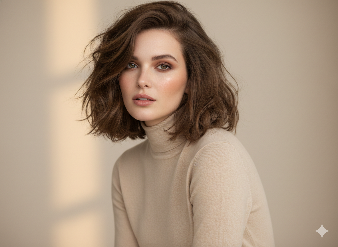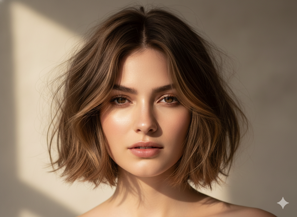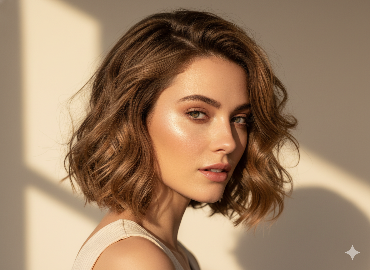 A wavy bob adds softness and natural movement. The key is to keep the waves loose and not too voluminous at the sides. This style creates dimension and helps avoid a flat or overly round appearance.