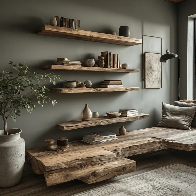 Wall-mounted shelves are classic floating pieces. They give storage without taking floor space. You can stack books, show plants, or place small art on these shelves. Shelving can be single thin boards for a minimalist look or layered boxes for a modern collage. Because shelves are off the floor, you can clean under them and use the space more cleverly. They also let you create vertical displays that draw the eye up, making the room feel taller. Good shelf styling balances function (storage) and fashion (display) so the room stays useful and pretty.