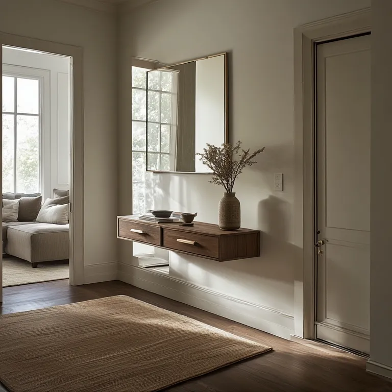 Floating entry consoles combine looks and function. Choose a design with hidden drawers to keep clutter out of sight. Add a mirror above to bounce light and make the space feel larger. Use a slim shelf under the console for shoes or baskets. The key is to keep it simple and tidy — floating consoles look best when uncluttered. This gives your guests a calm, organized entrance and keeps your daily routine smoother.