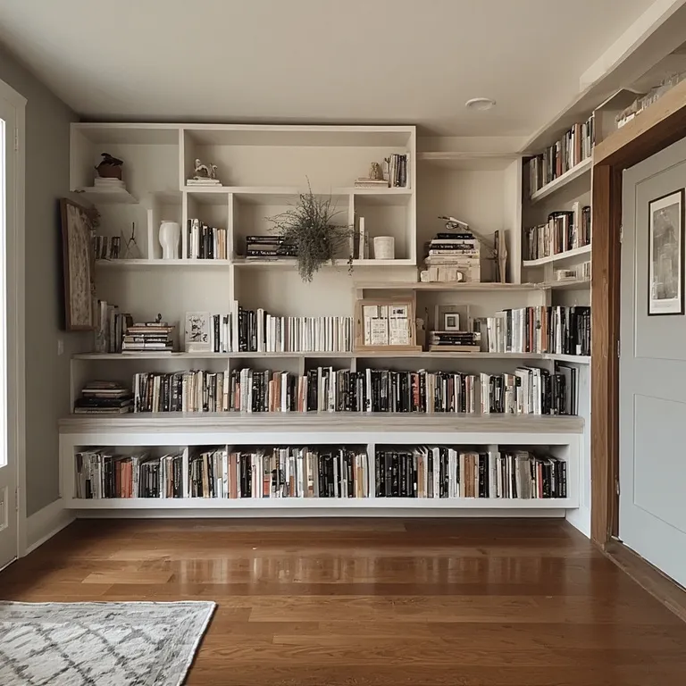 Floating bookcases and media storage keep heavy items off the floor and display collections in a stylish way. Long floating shelves can hold rows of books, while stacked floating cubbies form a modern library wall. These units keep the room easy to walk around and let the floor be part of the visual design. Floating book storage can be arranged around windows or doors to use wall space smartly. They keep your books accessible and your living room clean and curated.